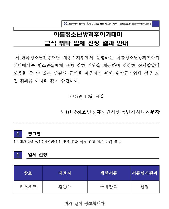 [아름청소년방과후아카데미] 급식위탁업체 선정 결과 안내